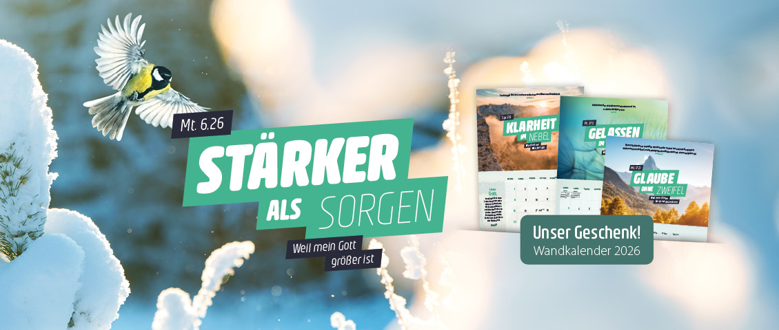 Gerne schenken wir Ihnen unseren besonderen Kalender „Stärker als Sorgen – Weil mein Gott größer ist“ für das Jahr 2026. Fragen Sie uns hier danach: Kalender 2026.